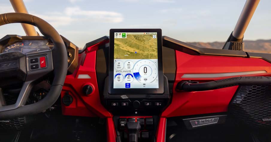 - Driver Forward Information Center with 4" color display + rotary speedometer & tachometers, programmable service intervals, speedometer, tachometer, odometer, tripmeter, clock, hour meter, gear indicator, fuel gauge, coolant temperature, voltmeter, service indicator and codes, seat belt reminder light, gear indicator, DC outlet, Polaris P.A.S.S anti-theft system