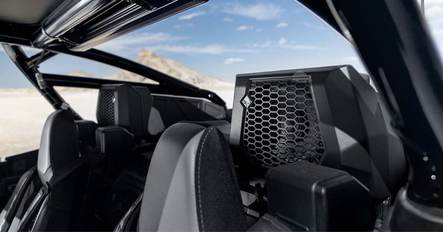 - Factory-tuned and integrated Rockford Fosgate Stage 4 audio system with RIDE COMMAND source unit. Includes (1) 1500-W 8-channel digital amplifier, (2) 100-W 1" tweeters, (2) 100-W 6.5" component front speakers, (2) 100-W 6.5" coaxial rear speakers, and (1) 10" subwoofer. *Audio System is IPX7 and IPX9K water immersion tested to withstand the wet elements.