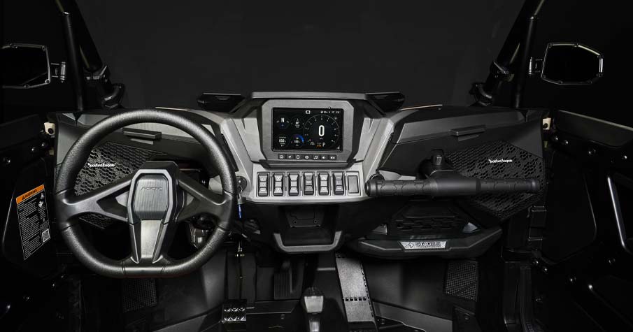 - Center mounted information center w/ 4" color display + rotary speedometer & tachometers, programmable service intervals, speedometer, tachometer, odometer, tripmeter, clock, hour meter, gear indicator, fuel gauge, coolant temperature, voltmeter, service indicator and codes, seat belt reminder light, DC outlet